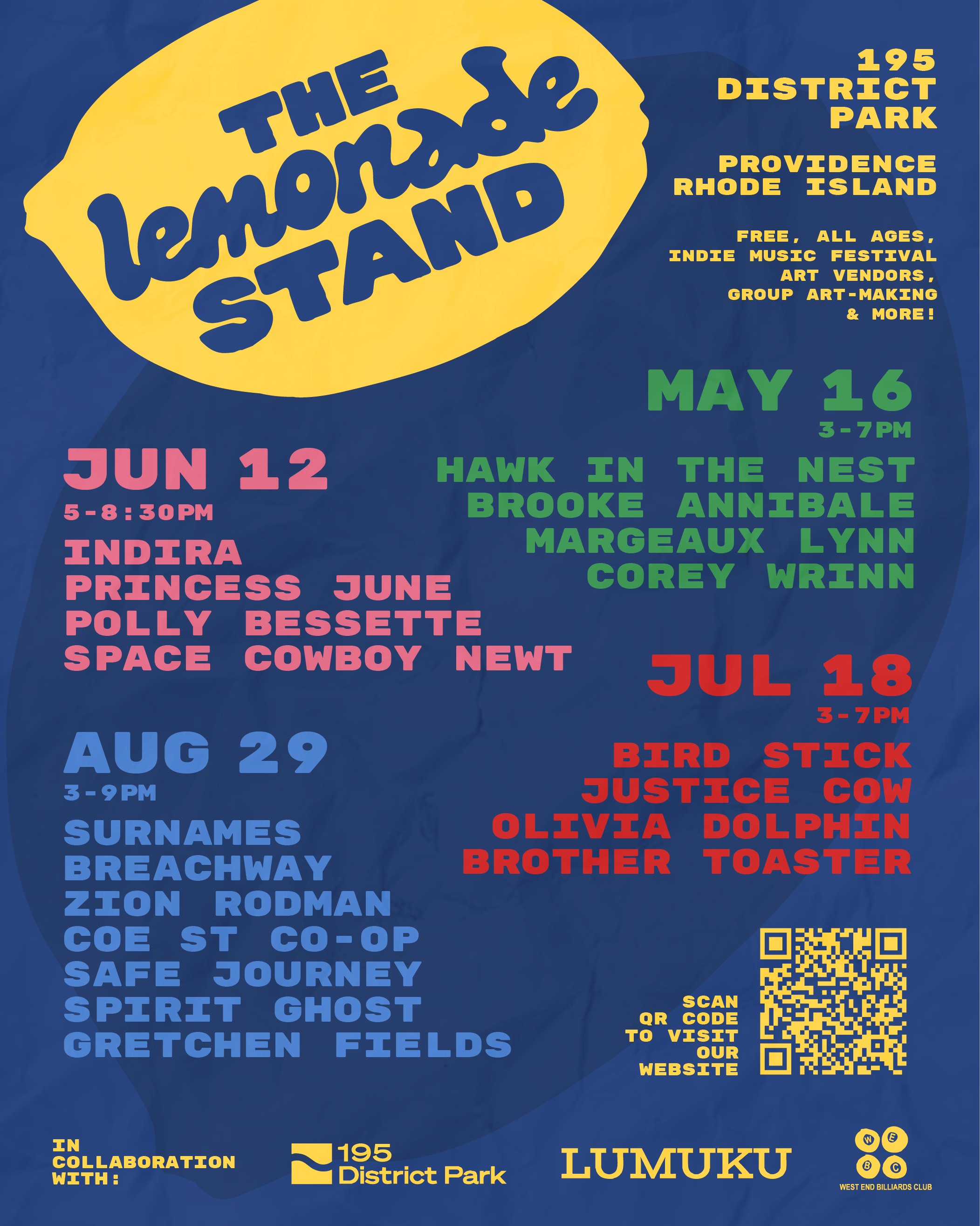 The Lemonade Stand is a project by a group of New England artists that organizes events to showcase creative talent in Providence, RI. We collaborate with local vendors, visual artists, and musicians to make memorable, seasonal shows for an ever-growing community.